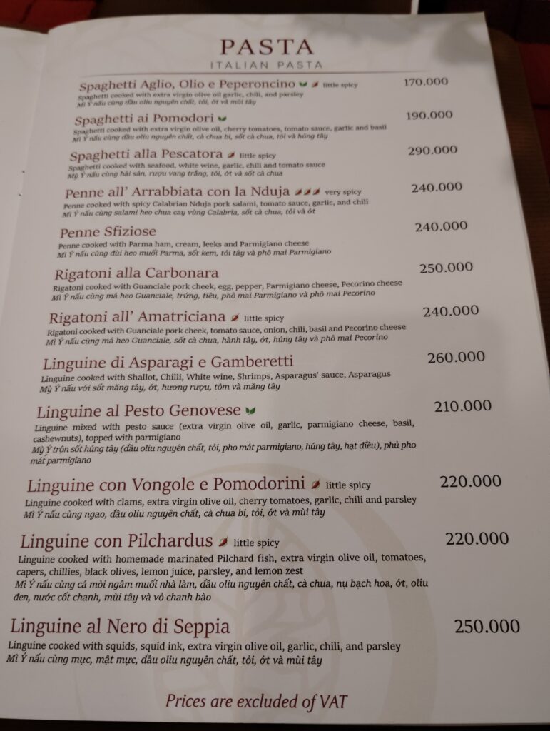 ペンネアラビアータ 240,000ドン(1,440円くらい)