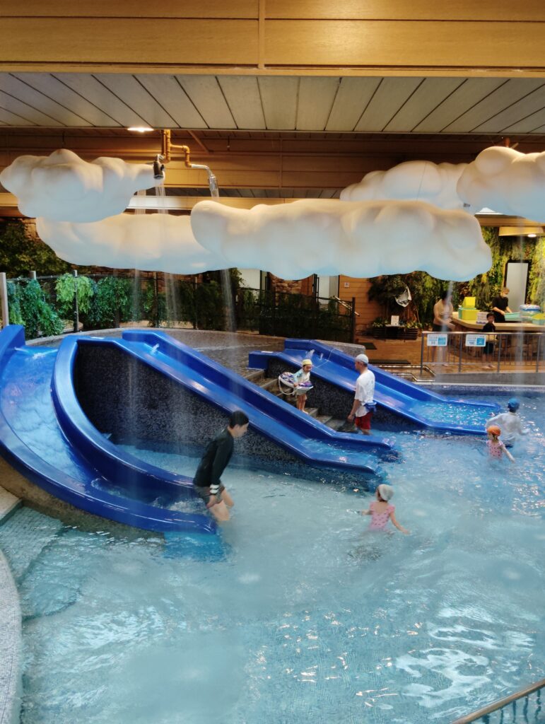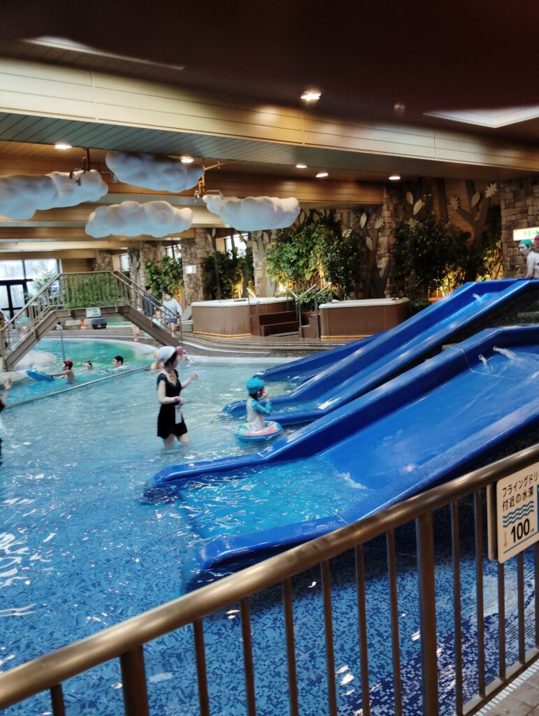 プールにはいるとすぐにスライダーがあり、奥には流れるプール、